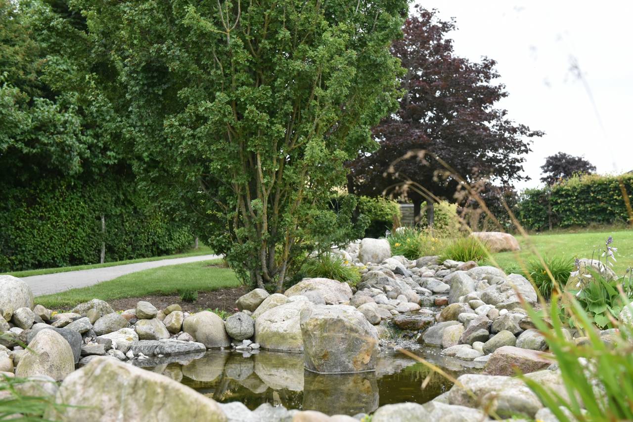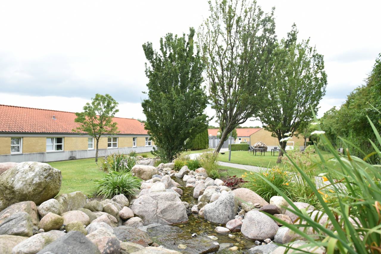 Landsbyen Møllevang har en stor have med stier, vandløb, højbed, pavillon og små sansemiljøer.